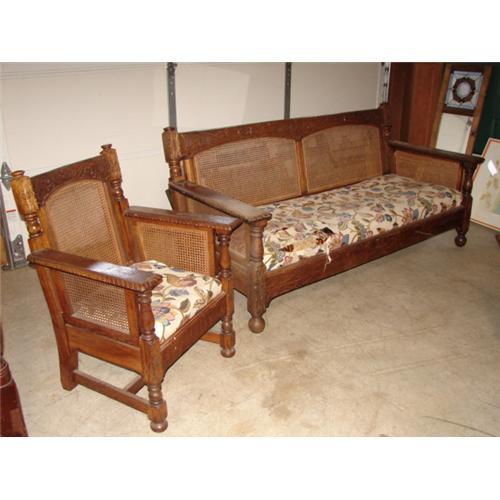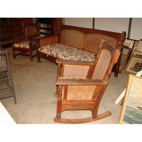ORNATE 3 PIECE OAK LIVINGROOM SUITE. Consists of sofa with cane back and sides (37” H to top of back, 80.5” L), armchair with cane back and sides (38” H to top of back), and rocking chair with cane back and sides (39” H to top of back).