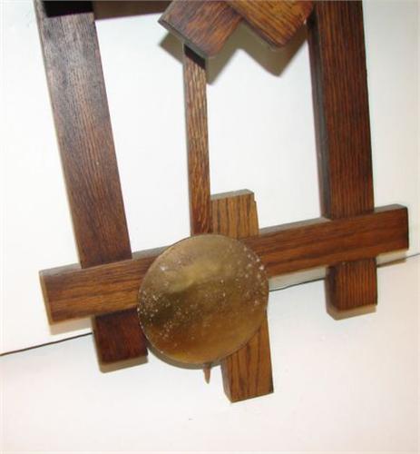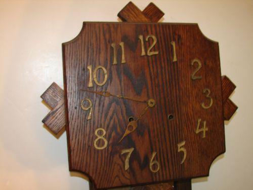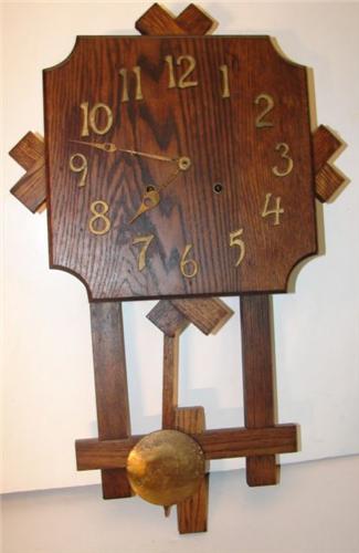OAK MISSION STYLE WALL CLOCK. Has pendulum. Has label on reverse that reads “San Remo/Manufactured Expressly for the/Philadelphia Inquirer Co.”. 27.5” H
