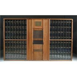 OAK POST OFFICE CLERK WINDOW FRONT. Pigeonholes for 128 mail recipients with center window and glass front. Brass plaque indicates Yale & Towne Mfg. Co. of Stanford, CT. SIZE: 67 1/4" w. x 41 1/2" h. x 8 1/4" d. CONDITION: Edge and molding have some small pieces missing, otherwise generally good. 1-671 (400-800)