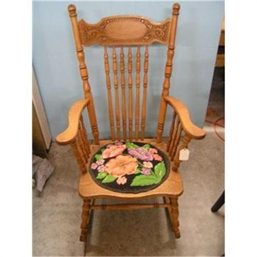 </font></strong>OAK ROCKER HAS NICE CARVINGS WITH NEEDLEPOINTE FLORAL SEAT. </font>