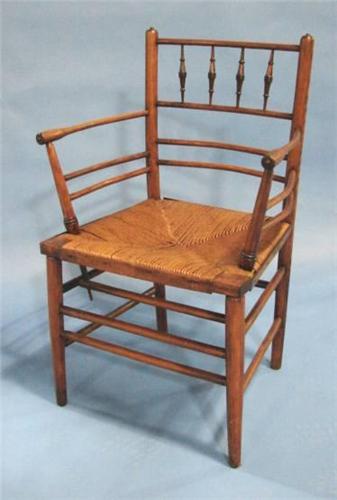 OAK RUSH BOTTOM ARM CHAIR. Rush bottom seat. Seat shows signs of wear. 32” H to top of back, 21.5” W, 17” H to top of seat