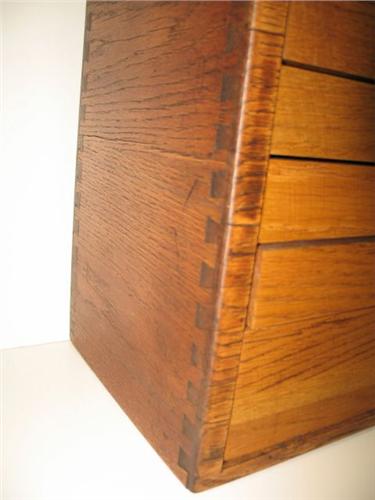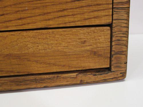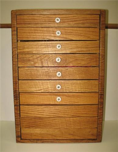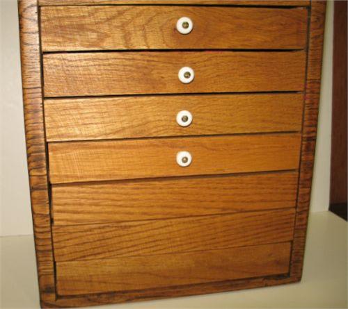 OAK SEWING CHEST. Has 10 drawers and dovetailed casing. Has recently been refinished. Newly replaced porcelain drawers on top 7 drawers and bottom 3 drawers have no knobs. 14.75” W, 20.25” H, 9.5” D