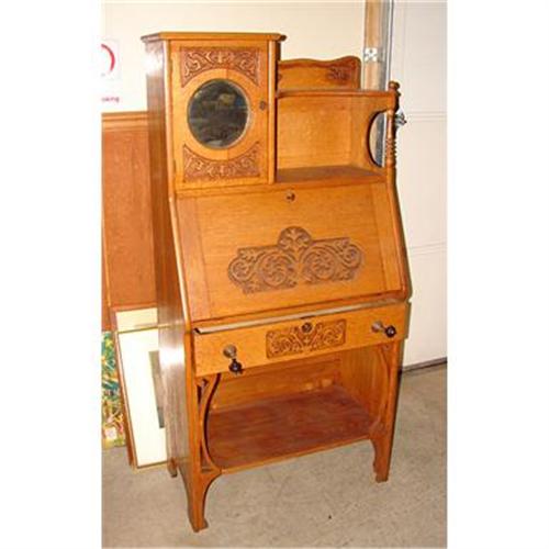 ORNATE OAK SIDE-BY-SIDE. Has mirrored door at top left next to shelf over slant-lid over single drawer with tear drop pulls. Fitted interior. 60” H, 28” W, 15.5” D