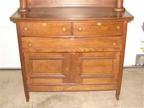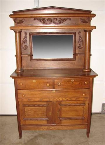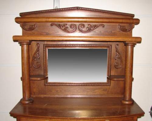 OAK SIDEBOARD WITH MIRRORED BACK. Has two drawers over single drawer over two doors. Drawers are dovetailed. Has a beveled mirror at back with columns at both sides and candle shelves. 74" H, 44" W, 19" D