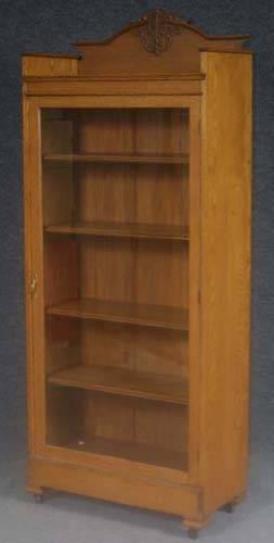 OAK SINGLE DOOR BOOKCASE with carved crest, refi
