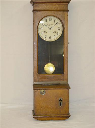 OAK TIME CLOCK FROM THE SIMPLEX TIME RECORDER CO., GARDNER MA (48" H X 15" W X 11 1/2" D) - GLASS DOOR REPLACED, IMPERFECTIONS