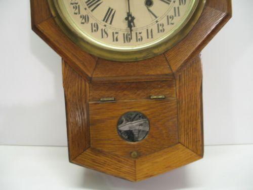 OAK WALL REGULATOR CLOCK. No mark on face. Oak casing. Single door at bottom with small circular glass window. 17.5” H, 11.5” W