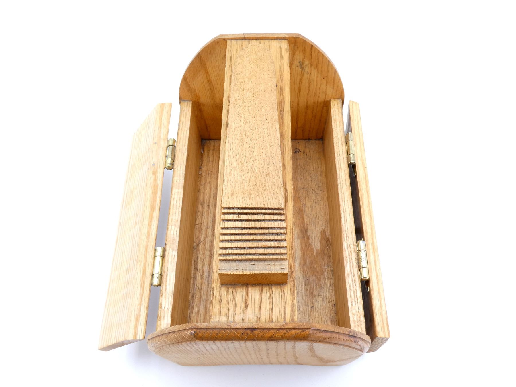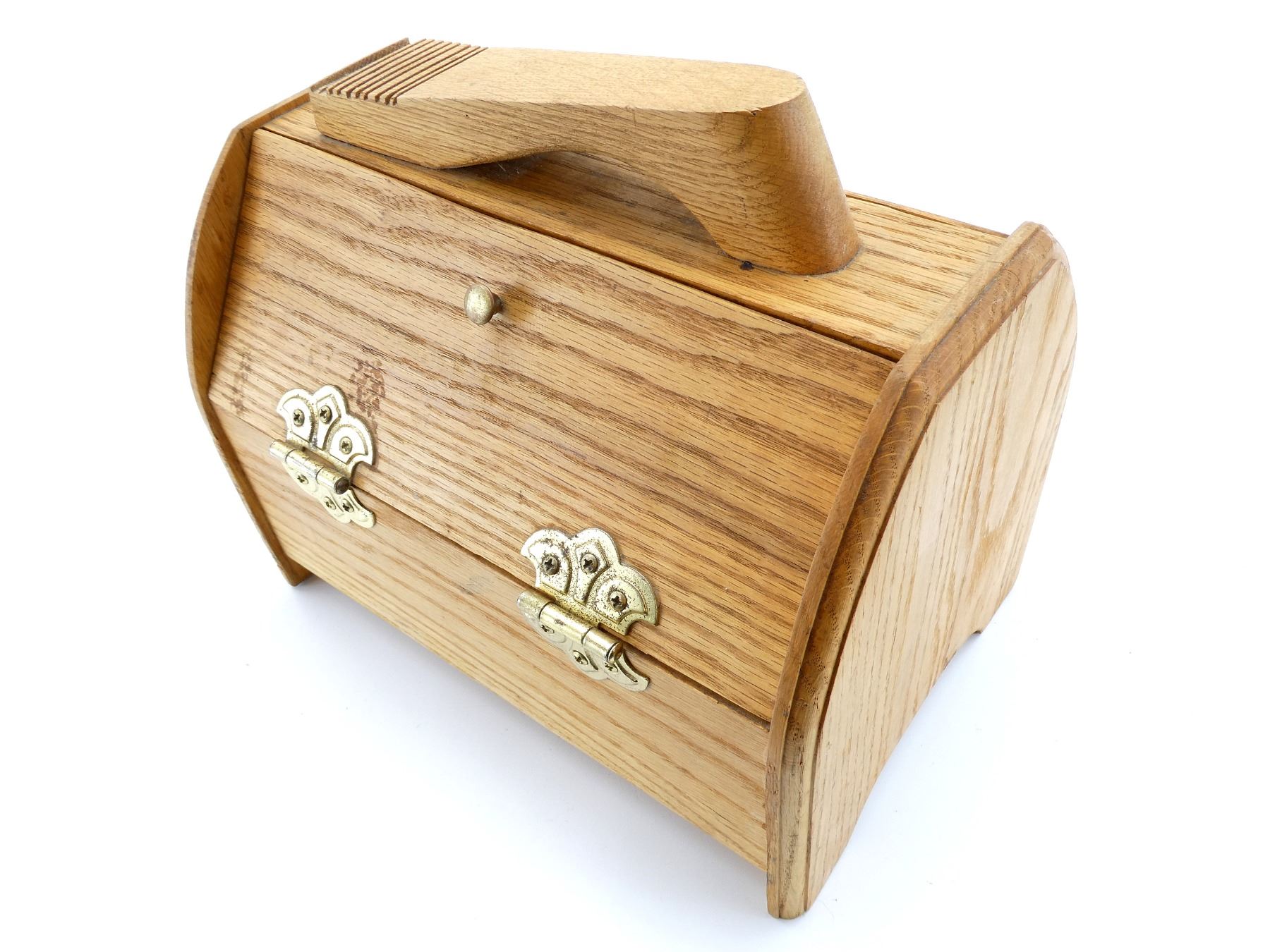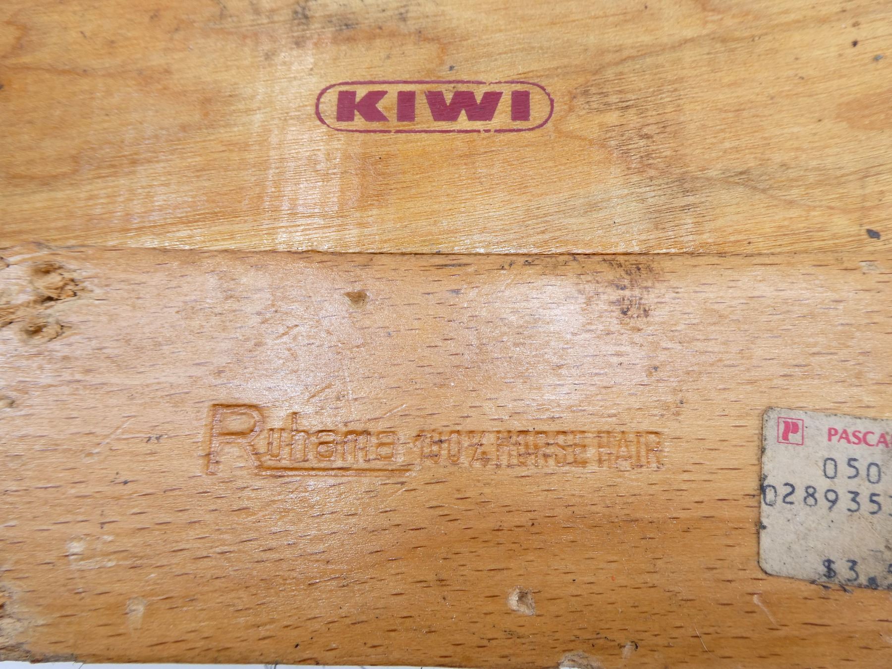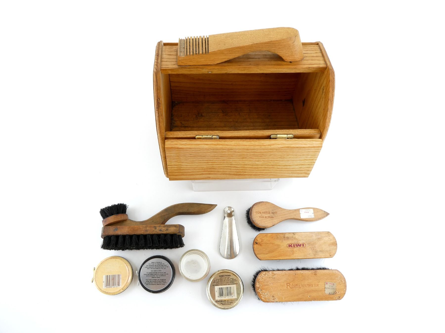 LOT INCLUDES; (1) OAK WOOD SHOE SHINE BOX, BRASS HINGES / HANDLES, NO VISIBLE MARKINGS, DOOR ON EITHER SIDE OF BOX THAT OPENS, APPROX. 11.75" X 8" X 10.25", (4) SHOE POLISHING BRUSHES, VARIOUS SIZES, SOME MADE USING HORSE HAIR, VARIOUS MARKINGS, (1) METAL SHOE HORN, NO VISIBLE MARKINGS, OAL APPROX. 4 3/8" & (4) CANS OF SHOE POLISH / PROTECTOR CREAM, VARIOUS COLOURS, VARIOUS MARKINGS. SEE PHOTOS.