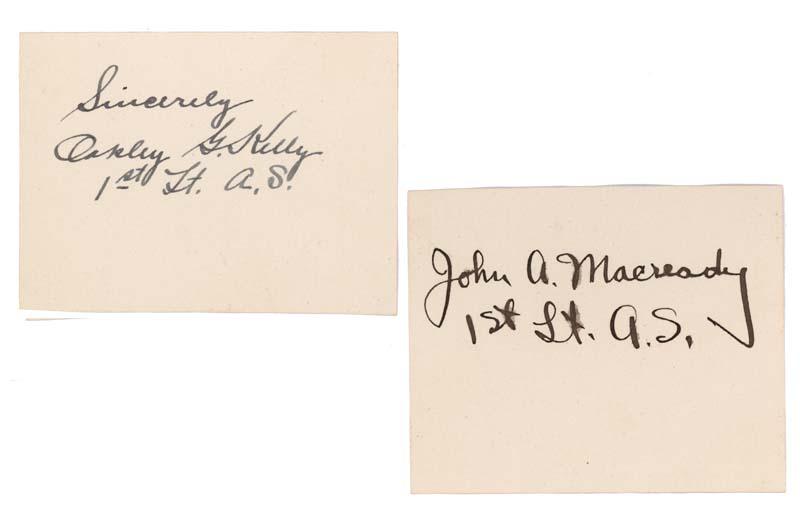 OAKLEY G. KELLY (1891 – 1966) American aviator who, with John A. Macready, made the first nonstop flight across the United States. Signed card. 3 1/4” x 2 1/2”. Mounting trace on verso. Fine.JOHN A. MACREADY (1887 - 1979) American aviator who, with Oakley G. Kelly made the first nonstop flight across the United States. Pair of signed cards - The pair made the first non-stop trans-continental flight over North America. 3 1/4” x 2 1/2”. Mounting trace on verso. Fine. A choice pair of avation autographs.