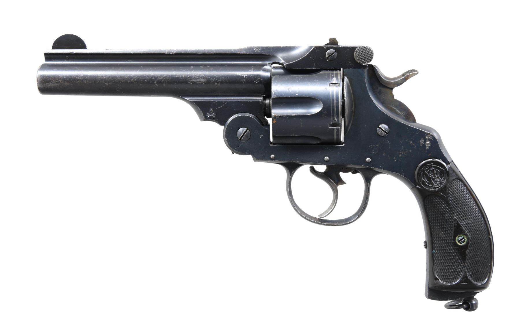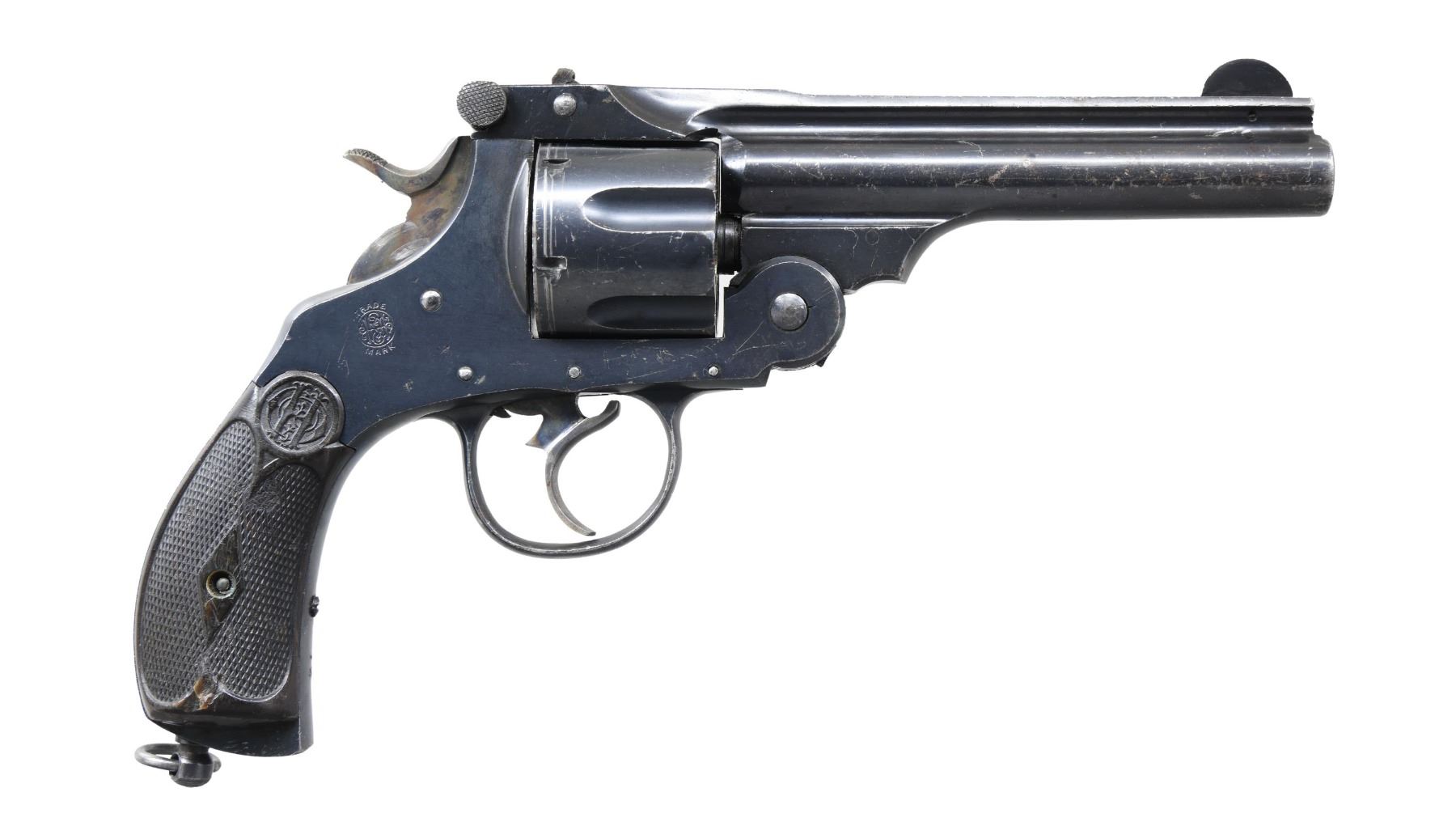Cal. 455. S# 12. Bbl. 5". Round blade front sight. V-notch rear sight. Spanish copy of an S&W top break used by the British during WW1. Left rear of frame has British proofs. Blued finish with case colored trigger & hammer. Checkered black grips that display a poor fit. Lanyard ring present on bottom of grip frame. UNATTACHED ACCESSORIES: aftermarket black hardcase. CONDITION: grips show some chips, checkering wear & dings. Trigger & hammer retain most of their case colors with some light oxidation & operational wear. Balance of metal retains 70% blue with scattered edge wear, fading & light oxidation. Hammer will not hold at full cock on SA but DA trigger appears to function. Very good bright bore. (24-6852/MJC). CURIO. $350-550.
