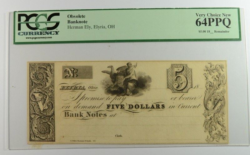 OBSOLETE BANK NOTE HERMAN ELY, ELYRIA, OHIO $5.00 PCGS 64 PPQ