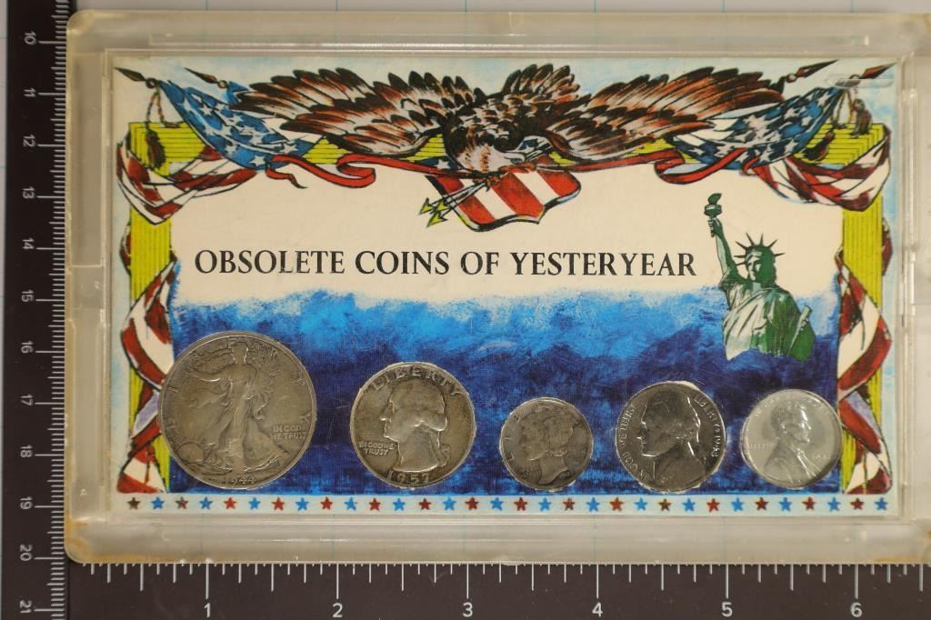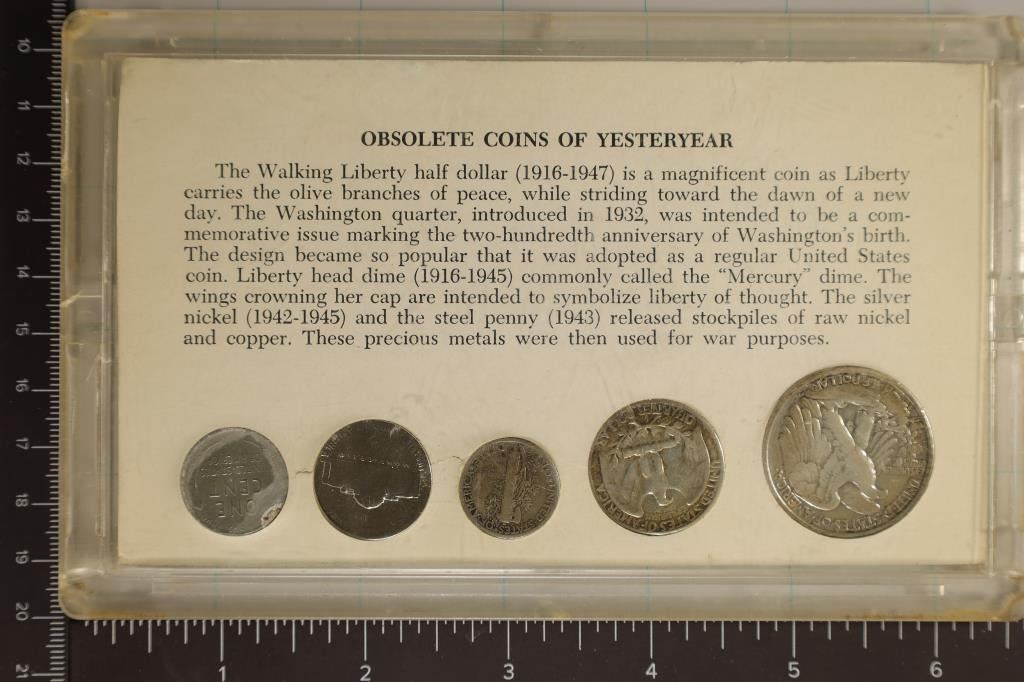 WALKING LIBERTY HALF DOLLAR, 1957 WASHINGTON SILVER QUARTER, 1942-S SILVER MERCURY DIME, 1943-D 35% SILVER JEFFERSON WAR NICKEL AND 1943 LINCOLN STEEL WAR CENT, IN HARD PLASTIC CASE