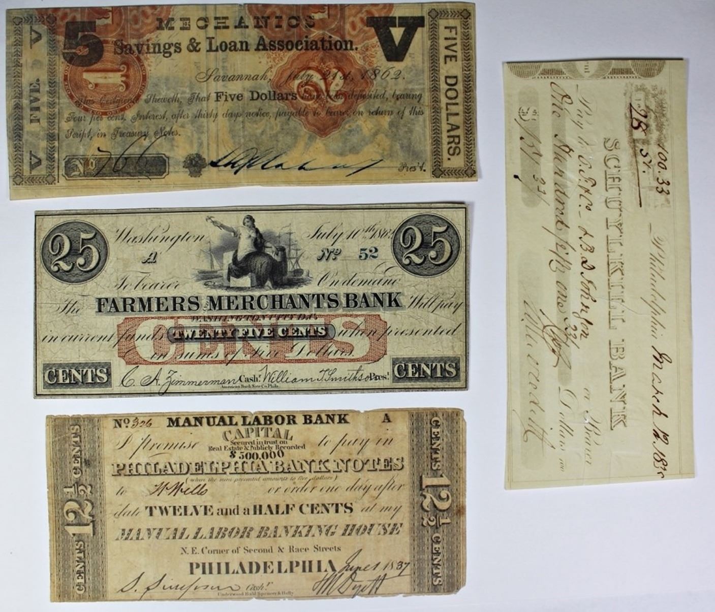 TWELVE AND HALF CENTS MANUAL LABOR BANK PHILADELPHIA 1837, TWENTY FIVE CENTS FARMER'S MERCHANT BANK WASHINGTON DC 1862, MECHANICS SAVINGS AND LOA 45.00 1862 SAVANNAH PRINTED ON SHEET OF $1.00 AND $2.00. NEAT! 1839 CHECK