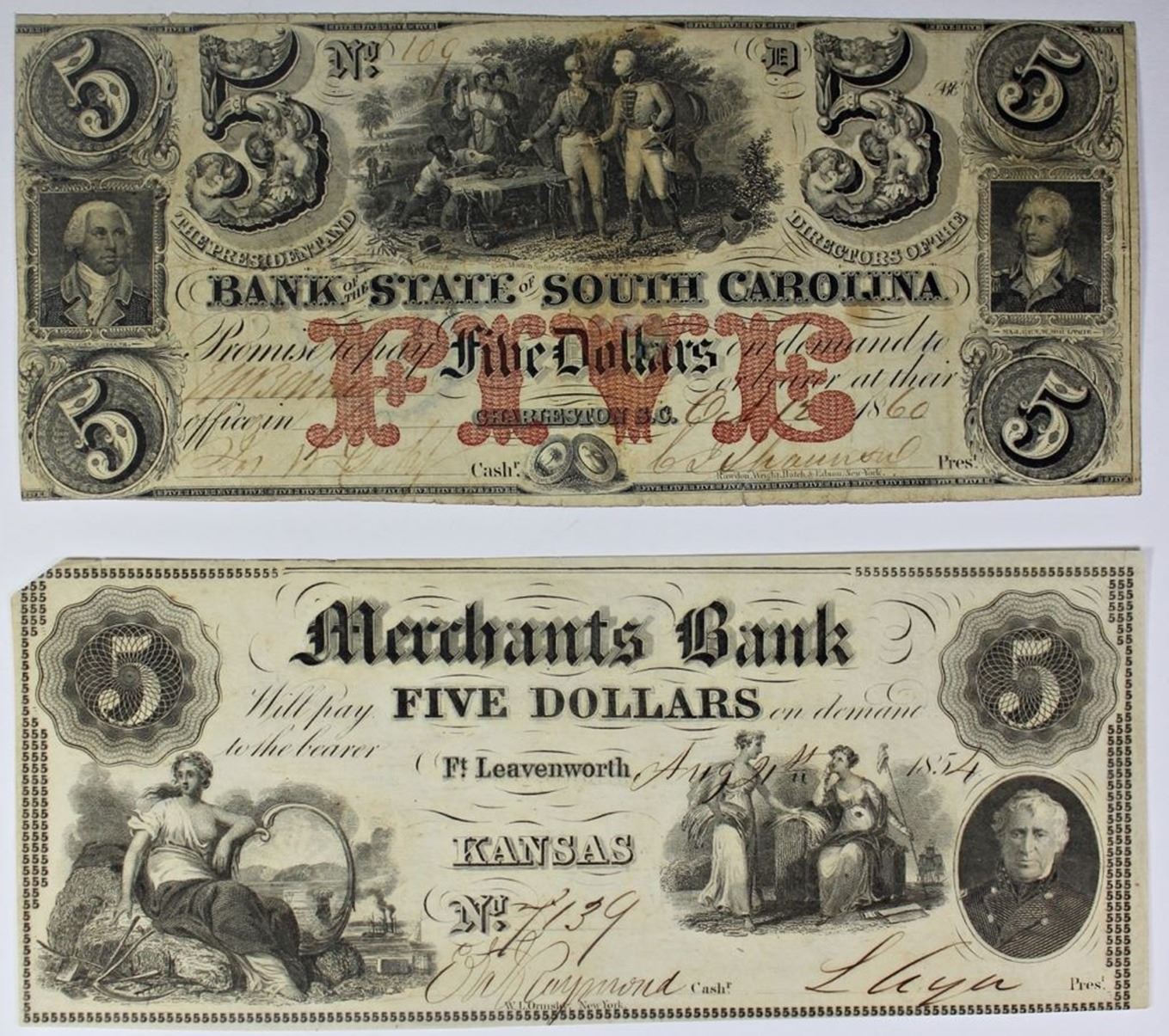 $5.00 SOUTH CAROLINA BANK 1860 AND MERCHANTS  BANK FT. LEAVENWORTH, KANSAS $5.00 1854.  ESTIMATE: $200-$250