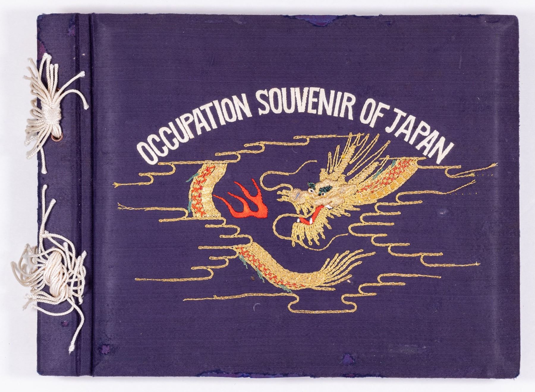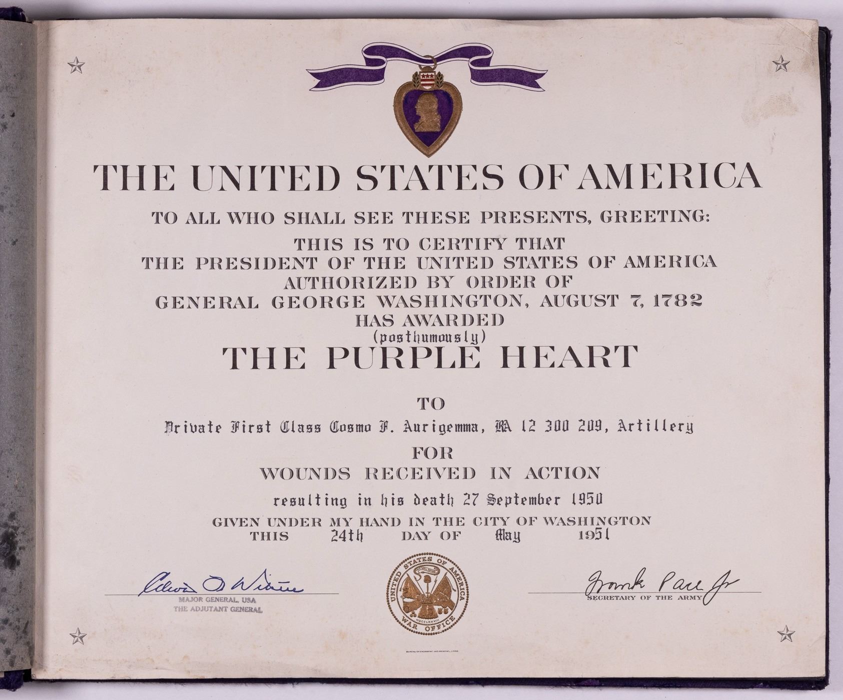 Photo album belonging to Private First Class Cosmo F. Aurigemma, who served in the occupation of Japan and Korea from 1948 to 1950. The photos show soldiers socializing, boxing, Japanese people, family photos, machine artillery, soldiers in the field, a posthumous certificate of the Purple Heart for Aurigemma, and a Certificate of Memorial for Aurigemma with printed signature of President Truman. Album contains 151 photos. Photos approx. 3.25 x 4.5 inches. Some photos have inscriptions on them. The photo album also contains an embroidered map of Japan. Private Aurigemma was killed in action on September 27, 1950 in Korea, possibly in Osan, where the Eighth Army and the X Corps forced the retreat of the North Korean People's Army of Korea. 13.5 x 10.25 inches.