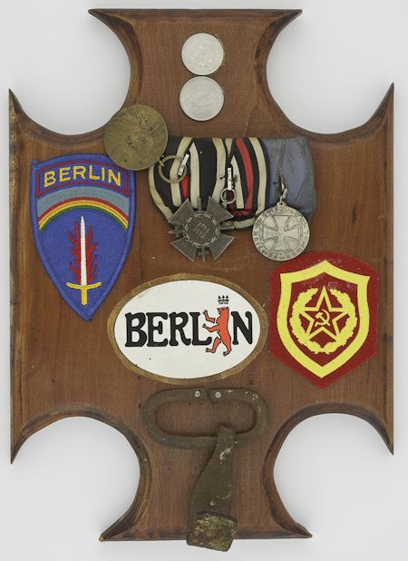 Nice souvenir grouping from a member of the American occupation force stationed in post-war Berlin, a 9 1/2" x 13" plaque constructed by the soldier comprised of: a World War I medal bar with three medals, a Russian motorized battalion patch, the soldier's U.S. Berlin patch, a hook from the main gate of the Olympic Stadium which was being replaced on the day he arrived, and some aluminum East German mark coins. With the soldier's letter of provenance.