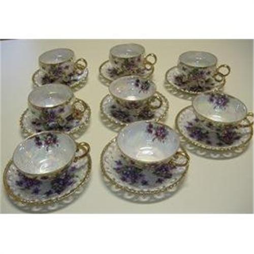 GORGEOUS OPALESCENT VIOLET PATTERED CHINA WITH RETICULATED LATTICE WORK. THERE ARE EIGHT CUPS AND SAUCERS AND A SET OF SALT AND PEPPER SHAKERS. ALL 18 PIECES WERE CREATED AND HAND PAINTED DURING OCCUPIED JAPAN. THE STRESS OF BEING OCCUPIED AFTER WW11 BROUGHT OUT CREATIVITY AND IMAGINATION THAT SHOWS IN FINE CHINA SUCH AS THIS SET. THE INSIDE OF EACH CUP IS THE MOST BEAUTIFUL PEARL OPALESCENT WITH HAND PAINTED VIOLETS INSIDE AND OUTSIDE OF EACH CUP AND RETICULATED SAUCER. ALL CUPS ARE FOOTED AND SOME HAVE FULL LOOPED FEET AND ROUNDER HANDLES THAT ADD A BEAUTIFUL VARIETY TO THIS SET. SET IS MINT WITH NO CRACKS, CHIPS, HAIRLINES, ETC.