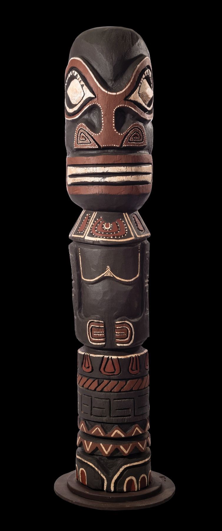 (1970s) A signature Oceanic Arts Tiki! Carved by LeRoy Schmaltz, this Marquesan style figure was an evergreen style for OA and was a staple of their catalog offerings over the years. Beautifully polychromed and affixed to a base. 66"x17". VG+ with typical wear.