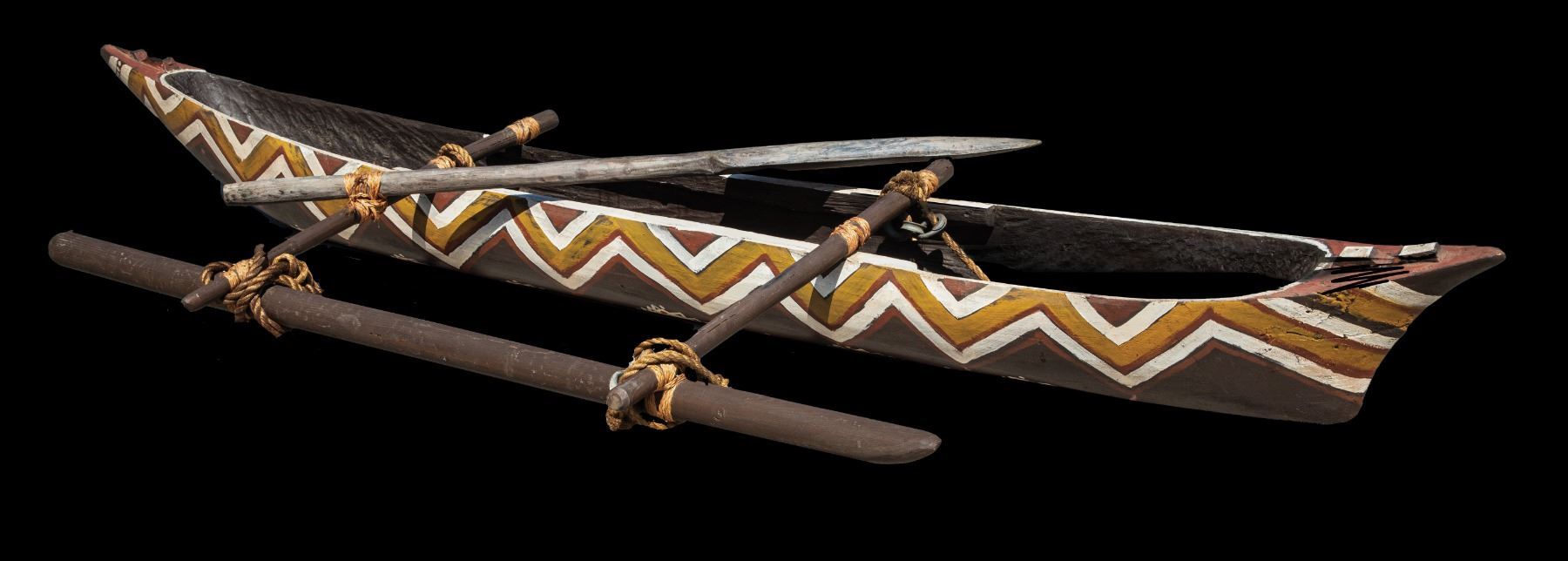 (1960s) An elaborately carved wooden outrigger with boom. This is one of the earliest styles from the OA catalog and this type was produced for countless bars and restaurants across the globe. This is the OA warehouse display model, hanging from the rafters of OA for over 50 years. Features a wonderful polychrome design treatment by LeRoy Schmaltz. This is the last of its kind and there are no more of these at OA. Hull:115”x12”x14”, Width of outrigger 38”
