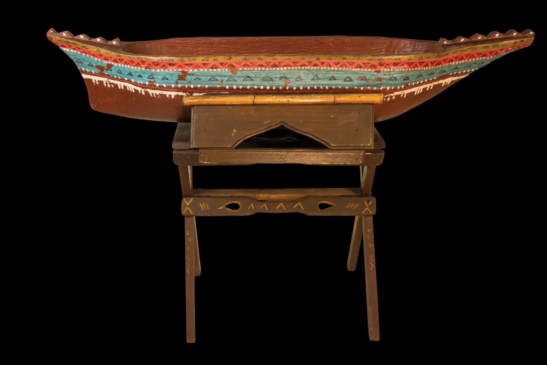 (1970s) A famous Oceanic Arts fiberglass outrigger punch bowl with stand. 32"x61"x34". VG+ with typical wear.