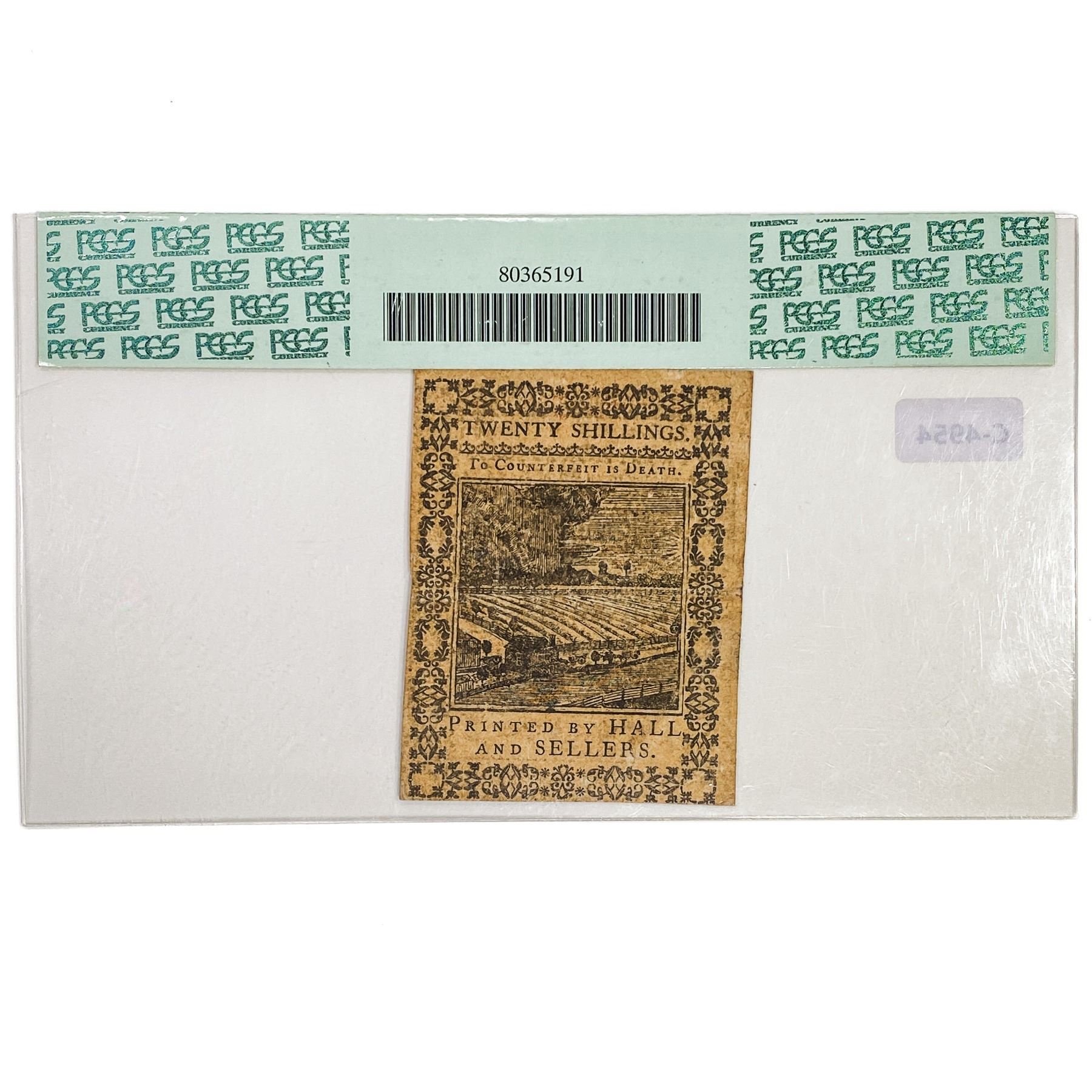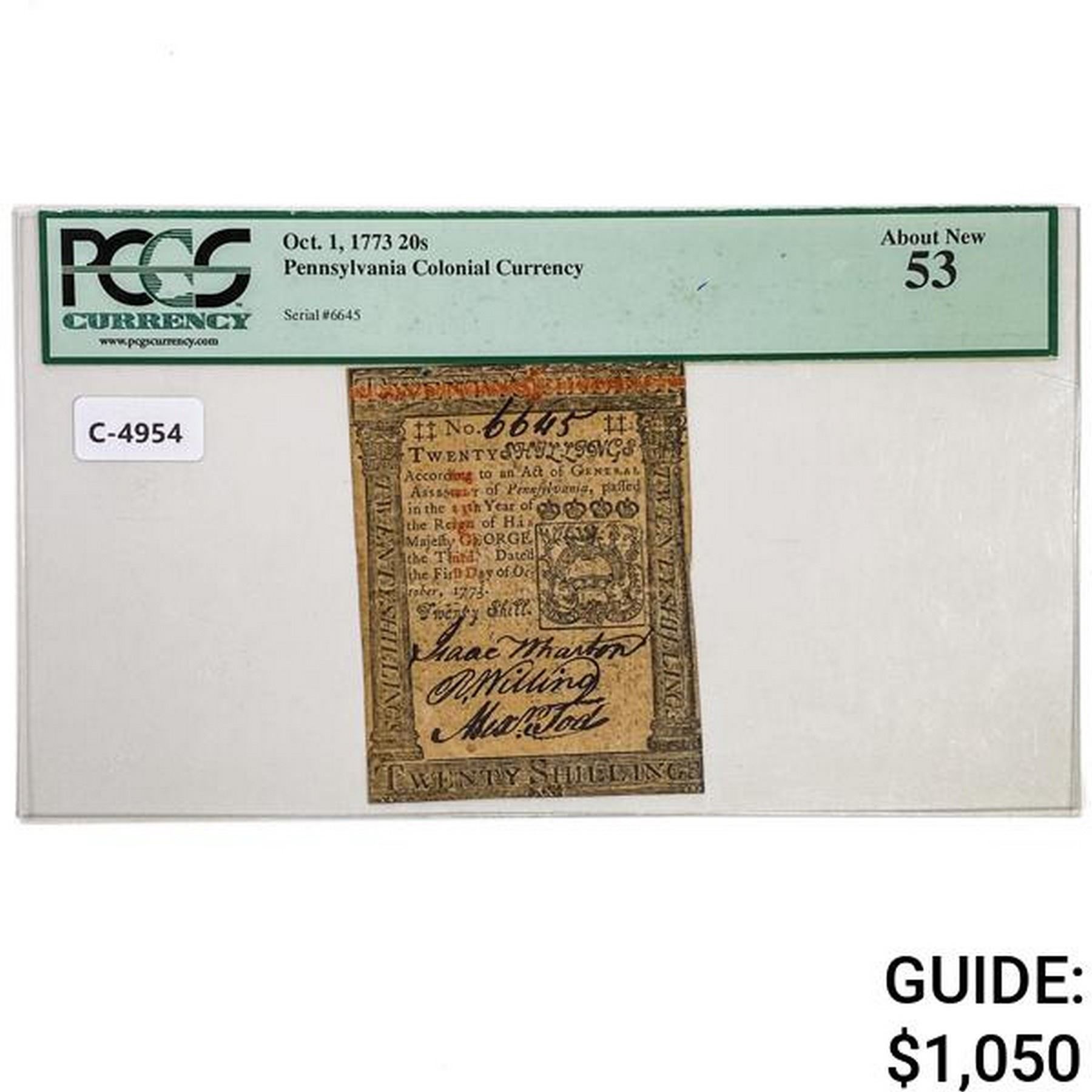 OCTOBER 1, 1773 20s TWENTY SHILLINGS PENNSYLVANIA COLONIAL CURRENCY NOTE PCGS ABOUT UNCIRCULATED-53