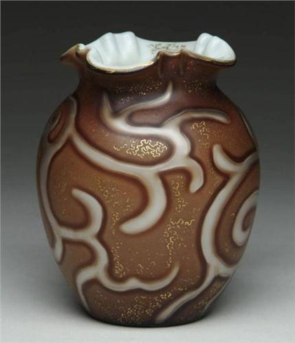 OCTOPUS VASE. Spectacular MOP vase in Federzeichnung design has brown satin glass with opalescent white air trappings and applied gold decoration. Signed on base "Patent 9159". SIZE: 6" t. CONDITION: Some wear to gold enameling, otherwise very good to excellent. 8-87396