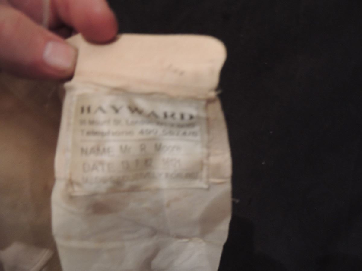 Has the original Hayward label with R. Moore and "MADE EXCLUSIVELY FOR 007" inside. I do believe this buttons up the back.