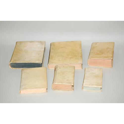 ODD VOLUMES IN VELLUM. A Group of 6 Volumes as Listed . Good condition. ***Discorsi, Ouero Sermoni Sopra Gli Evangeli, Dalla Prima Domenica Della Pentecoste Fin'all' Auuento. Di Alfonso Di Villegas - Volume Secondo (1615) Venetia: Appresso Giacomo De'Franceschi. Title vignette, small ink stamp inside back cover. ***Clypeus Philosophiae Thomisticae Contra Veteres Et Novos ujus Impugnatores, Authore R.P.F. Jacobo Casimiro Guerinois...Tomus Sextus. Metaphysica (1710) Venetiis: Apud Paulum Balleonium.. Ex-lib. ***Liber Psalmorum, Additis Canticis, Cum Notis Jacobi Benigni Bossuet...Tomus Secundus (1732) Venetiis: Excudit Jo: Baptista Albrizzi Hieron. Fil. Ex-lib. ***Dizionario Portatile Della Teologia Tradotto Dal Francese Nell' Italiano Ed accresciuto di Note, e di Articoli Dal P. Abate D. Prospero Dell' Aquila...Tomo I (1768) Venezia: Presso Tommaso Bettinelli. Notations on title page, small ink stamp inside back cover. ***Theologia Universa Speculativa Et Dogmatica....Paulo-Gabriele Antoine....Tomus Secundus (1743) Venetiis: Ex Typographia Balleoniana. Ex-lib, notation on title page. ***De Discretione Spirituum Liber Unus & Via Compendii Ad Deum Authore Joanne Bona (1727) Neapoli: Ex Typographia Felicis Mosca.
