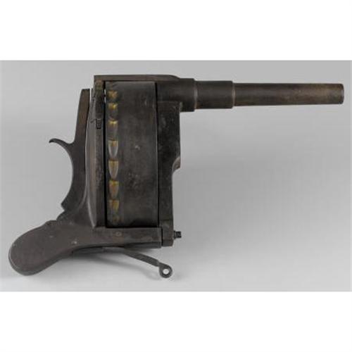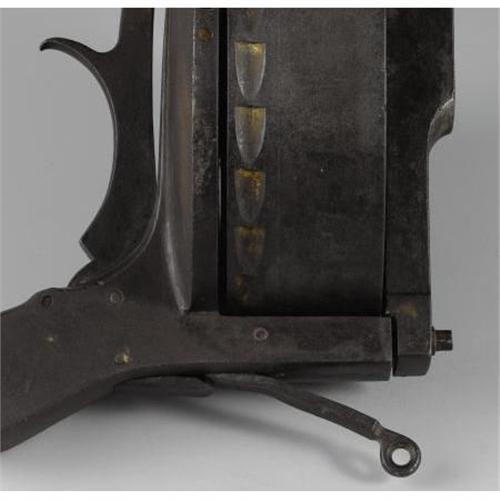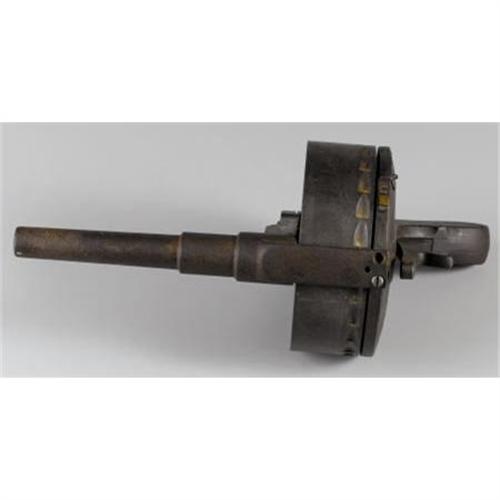 <B>ODDITY OR CURIO REVOLVER</B></I> - Probably a patent model or fantasy experiment; tooled steel with ratcheting cylinder in .56 cal and 7¾” stepped barrel; no markings other than 2 assembly numbers. <BR><BR><B>Condition:</B></I>Mechanically not operable<BR><BR><b>Shipping:</b> Bats, Clubs, Sticks, Swords, Rif (<a target="_blank" href="http://www.heritageauctions.com/common/shipping.php">view shipping information</a>)