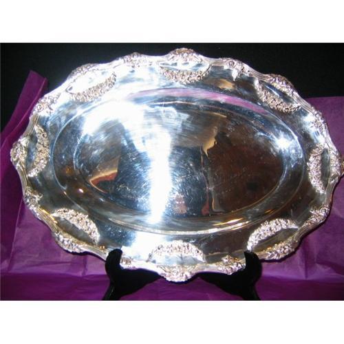 WOW WHAT A PIECE. THIS HAS IT ALL. THE PATTERN AROUND THE EDGE IS OF A HANGING GARLAND WITH A RIBBED EDGE.ON THE BACK ARE THE MARKS OF ODIOT APARIS AND THE HEAD OF MINERVA OF PARIS,, THIS IS THE HIGHEST GRADE OF STERLING COMING IN AT 950. PURE. IT DOES HAVE 3 LITTLE DENTS IN THE CENTER OF THE TRAY BUT REALLY DOES NOT DETRACT. WEIGHING IN AT 2LBS IT HAS A GREAT FEEL TO IT. 15.5" LONG AND 11" WIDE. A MUST HAVE.