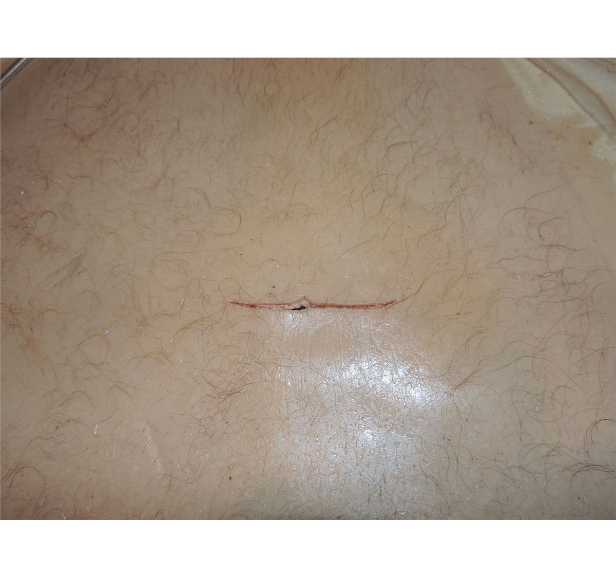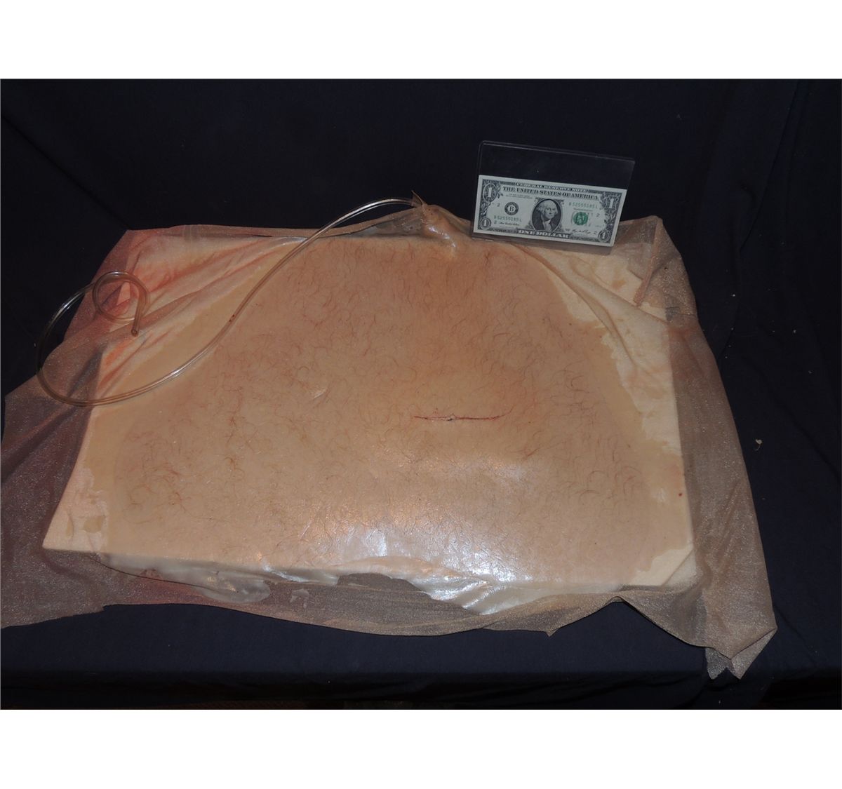 This is a very well made silicone on mesh backing with hand punched hair gun shot wound surgery appliance. Used in the TV show OFF THE MAP.
