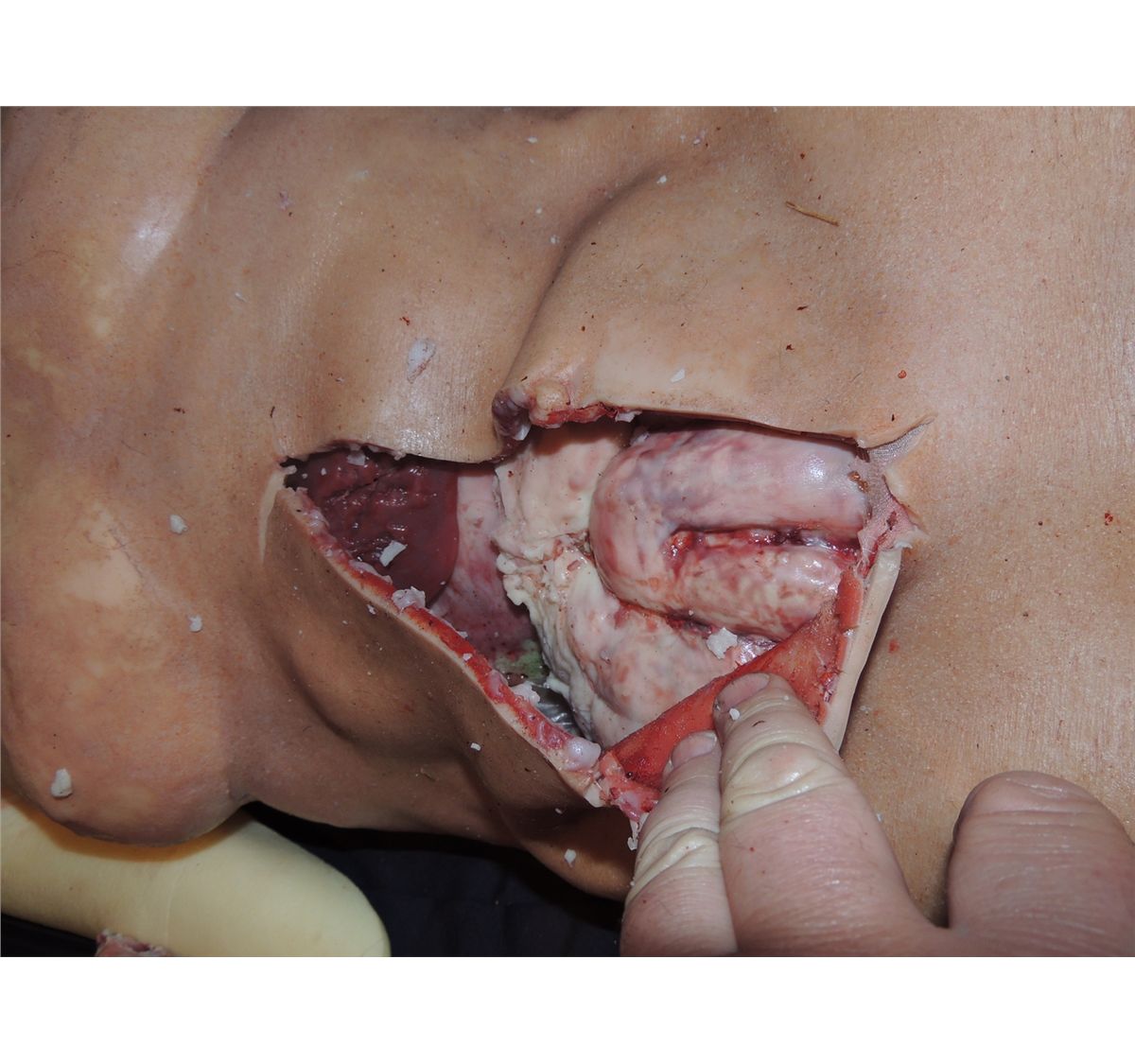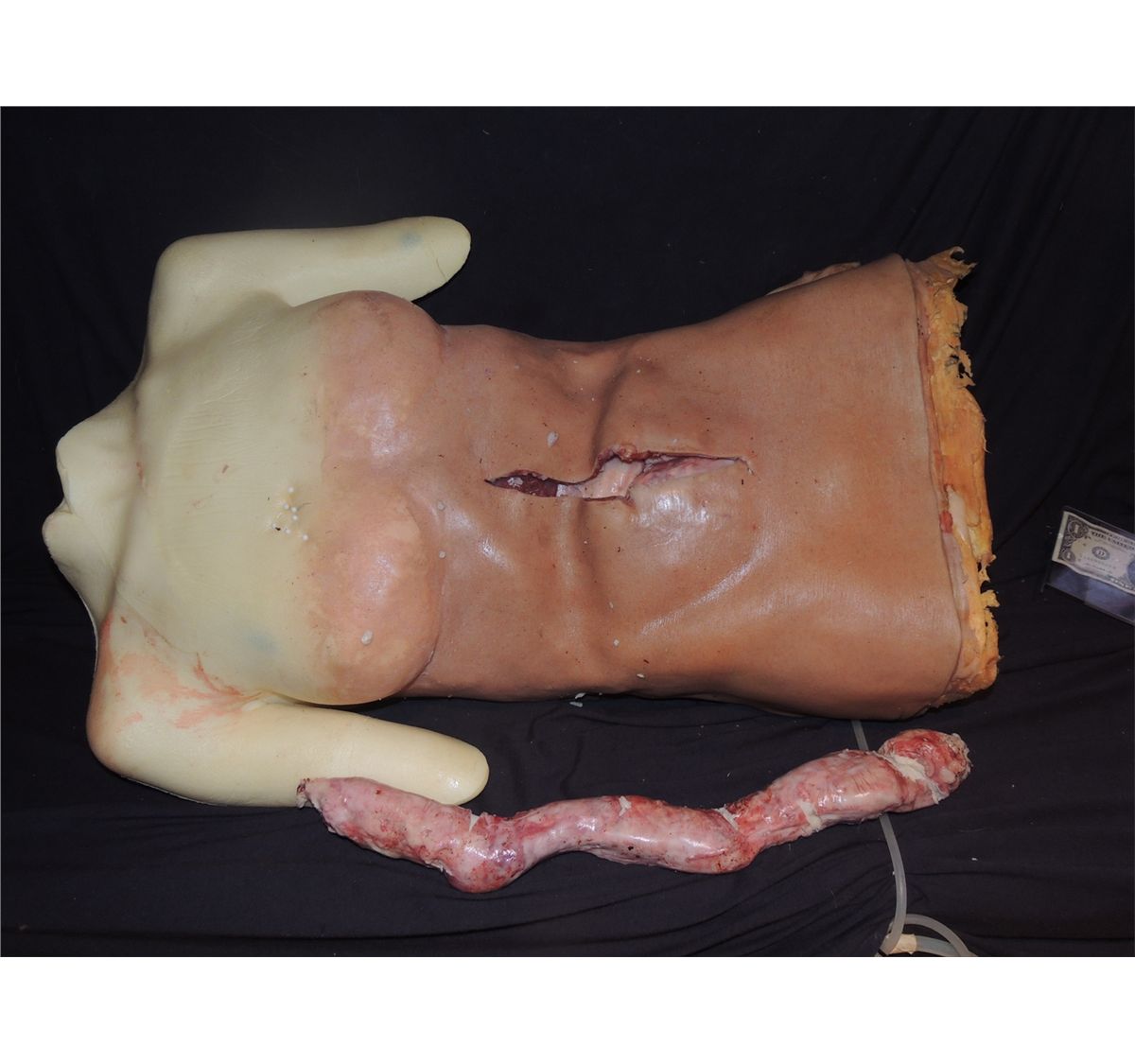 This is a full female torso made of silicone with entrails inside used the TV show OFF THE MAP. A portion of intestine is removable.