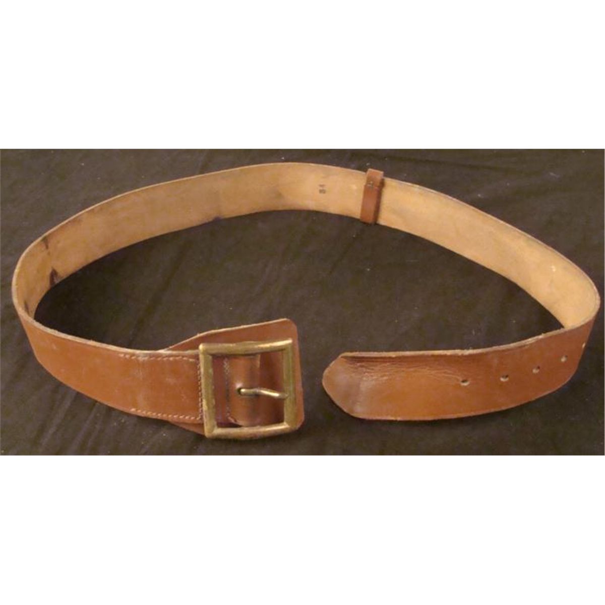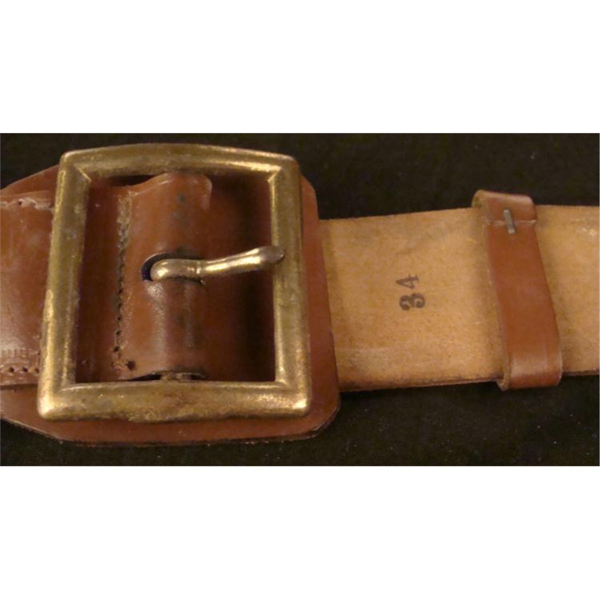 OFFICER'S WWII WIDE LEATHER DRESS BELT WITH BRASS BUCKEL-ID'D TO AAF OFFICER * GREAT ORIGINAL BELT-STAMPED 34 BUT HAS A MEASURED LENGTH OF 40" END TO END. HIGH QUALITY MEDIUM BROWN LEATHER. OFFICER NAME & NUMBER INSIDE. APPROX 1 3/4" IN WIDTH *