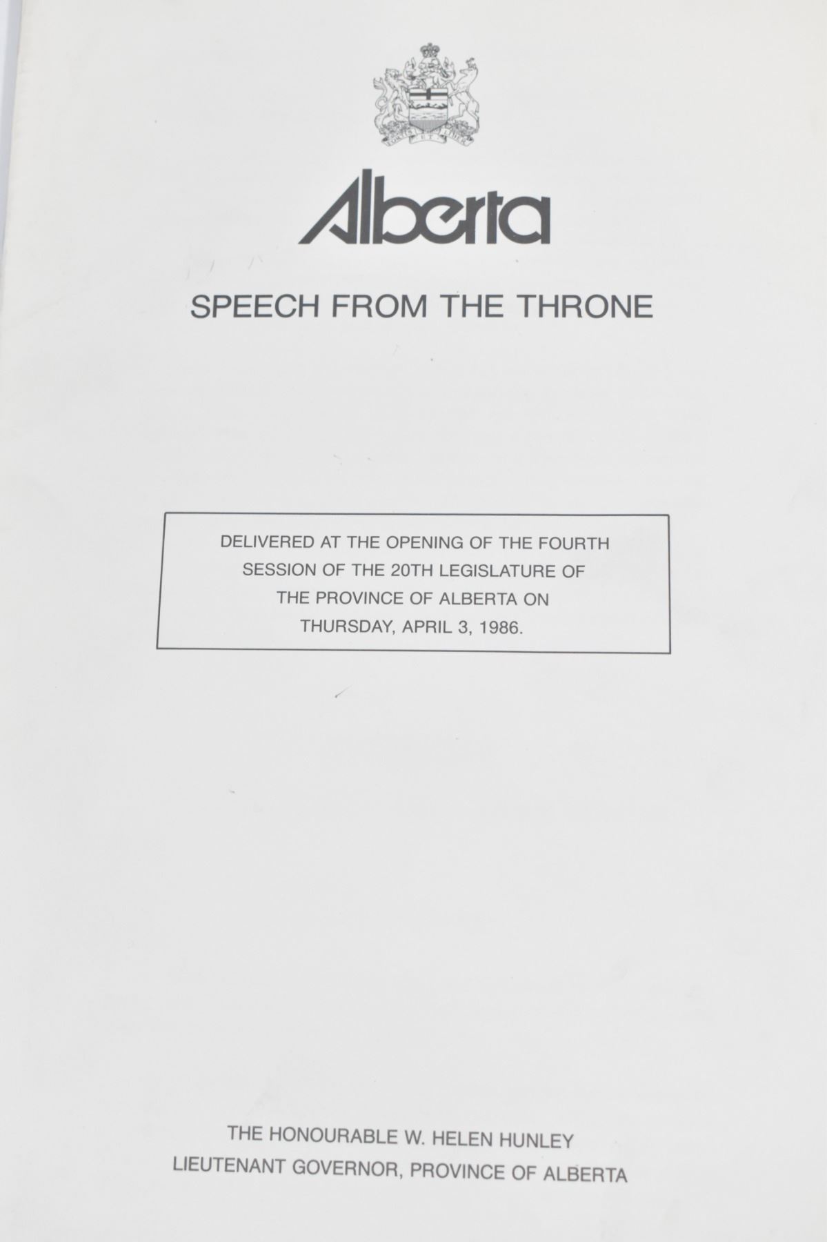 OFFICIAL ALBERTA SPEECH FROM THE THRONE ? 1986
