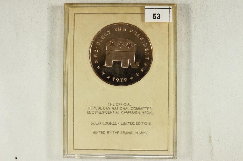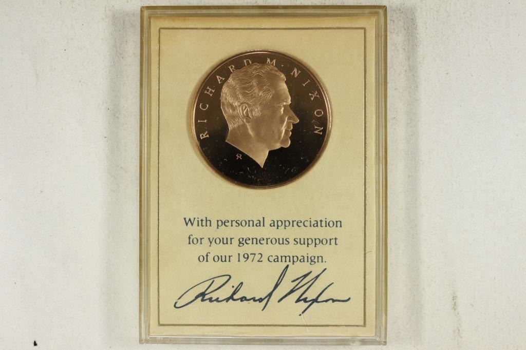 PRESIDENTIAL CAMPAIGN MEDAL GIVIN WITH PERSONAL APPRECIATION FOR YOUR GENEROUS SUPPORT OF OUR 1972 CAMPAIGN BY RICHARD NIXON. SOLID BRONZE LIMITED EDITION, MINTED BY THE FRANKLIN MINT