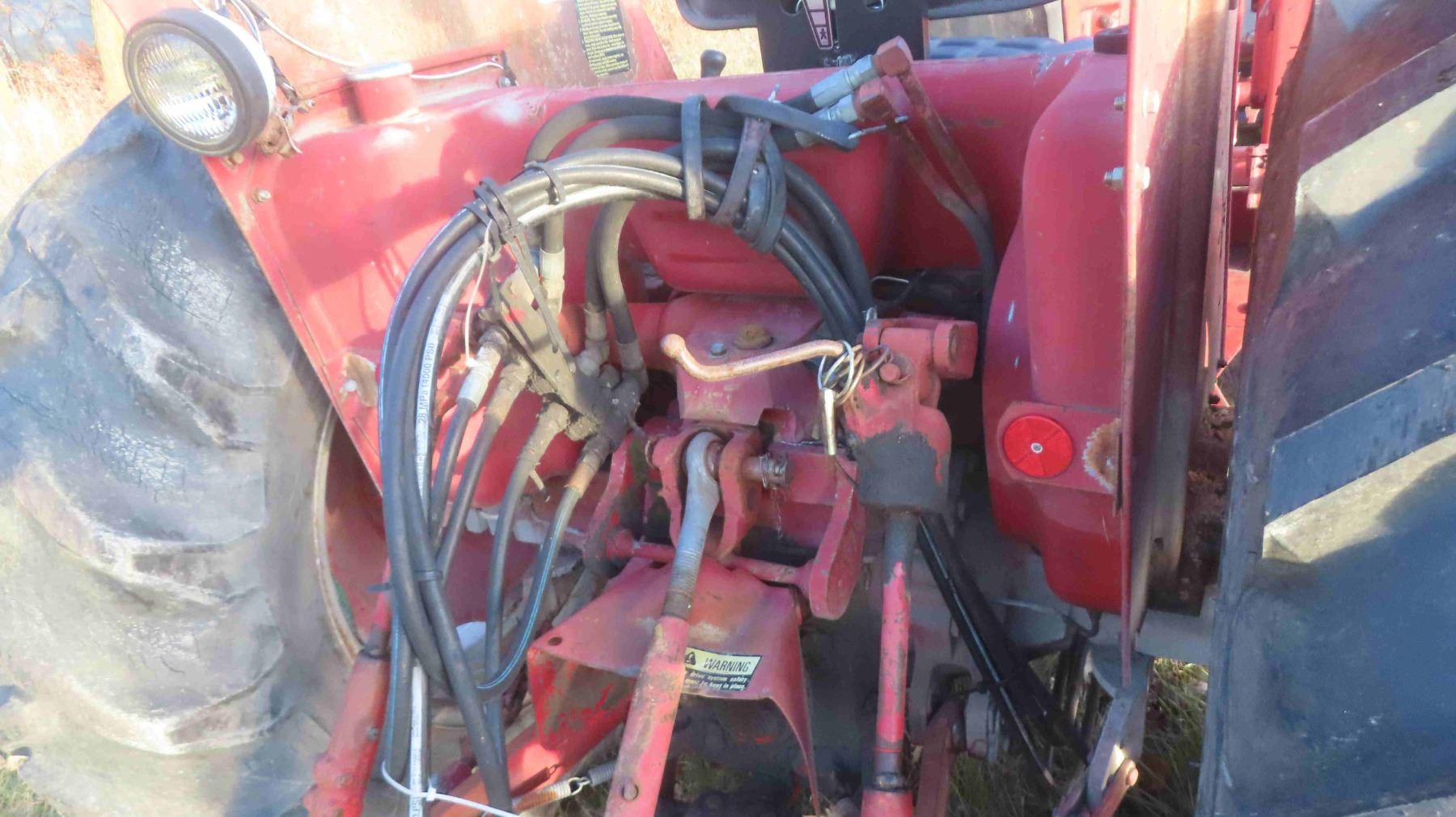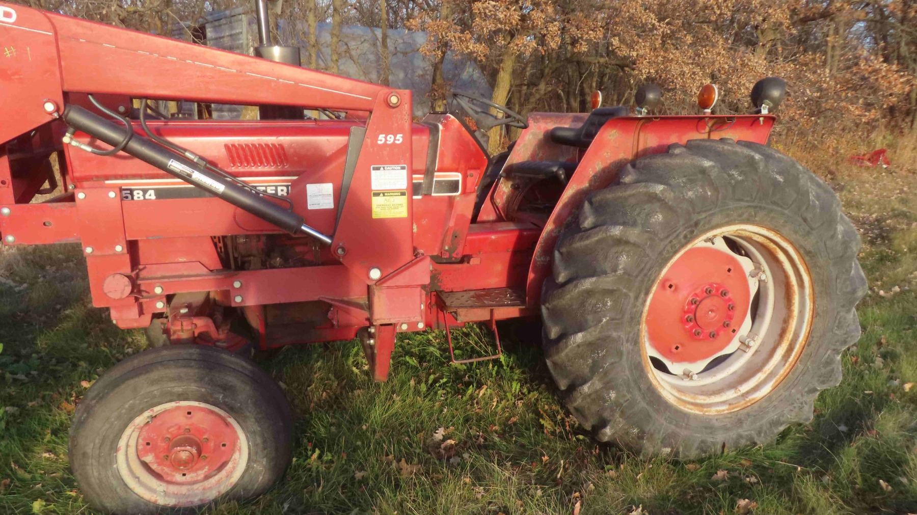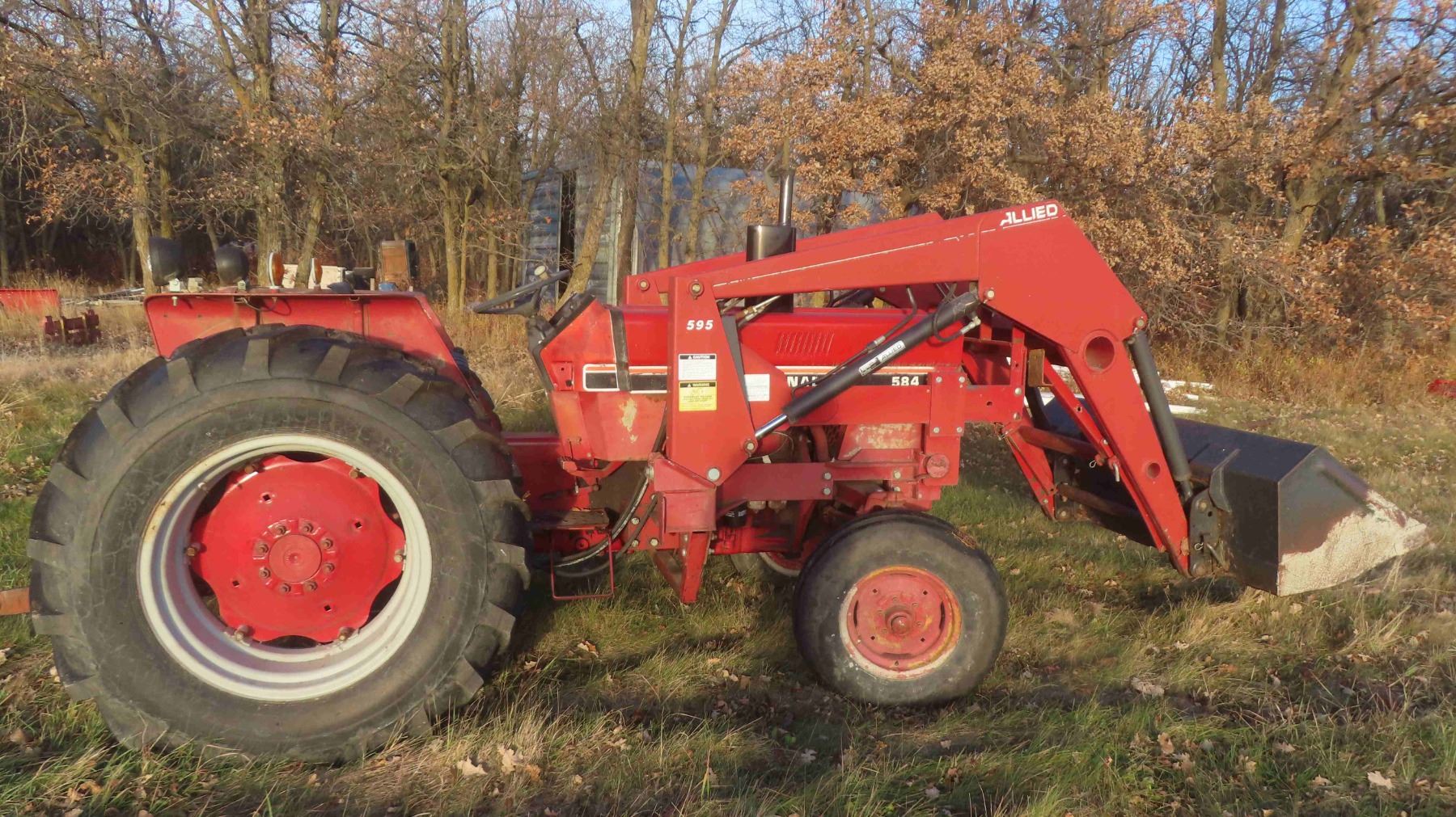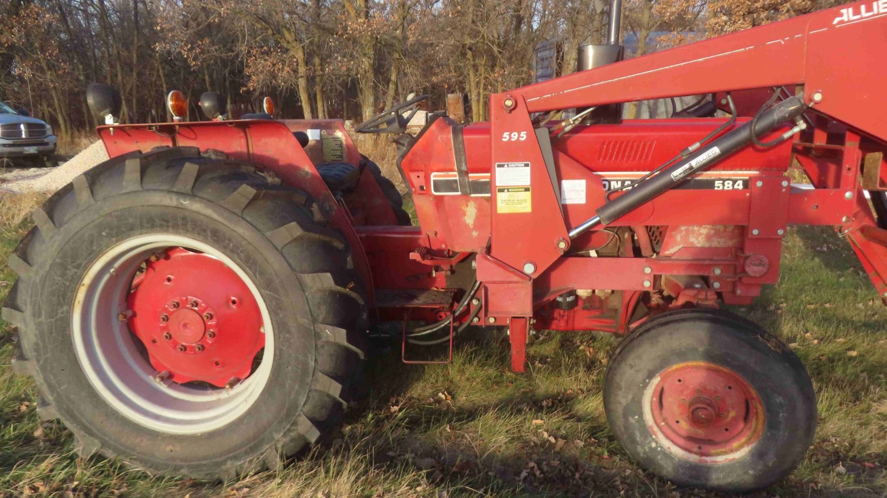 **OFFSITE** International 584 Tractor 3PH 540 PTO Dual Hydraulics 3325 Hours with Front End Loader, Bucket & Pallet Forks - Hydraulic Pump Needs To Be Replaced ** TRACTOR CANNOT BE PICKED UP UNTIL NOVEMBER 10TH**