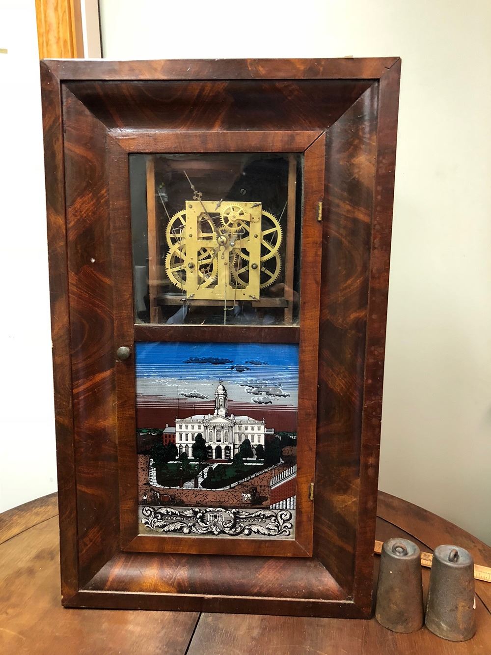 Waterbury Clock Company OG Shelf Clock with Hartford, CT State House on glass, 30 hour with weights, dial and pendulum.