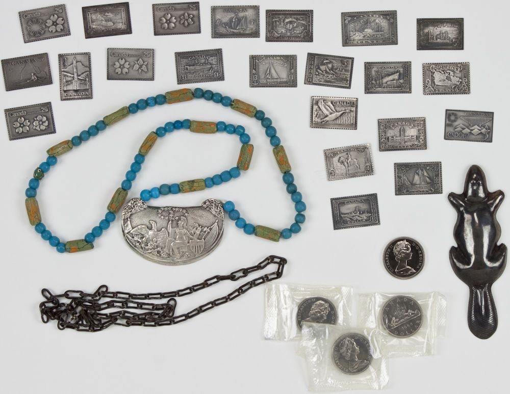 A lot of miscellaneous items related in some way to our northern neighbors, includes: three mint Canadian1968 one dollar silver coins in original boxes and cardboard sleeves; one proof 1970 Canadian one dollar coin honoring Manitoba; a 5" long metal beaver, the reverse bearing an unknown hallmark and star-shaped opening; and 22 sterling silver reproductions of 1968 Canadian-issued commemorative postage stamps. Also included is a necklace, 28" long, bearing a cast pewter[?] unhallmarked image of a symbol of France and an American eagle with lion heads above, strung to a 27" necklace of blue and green beads.