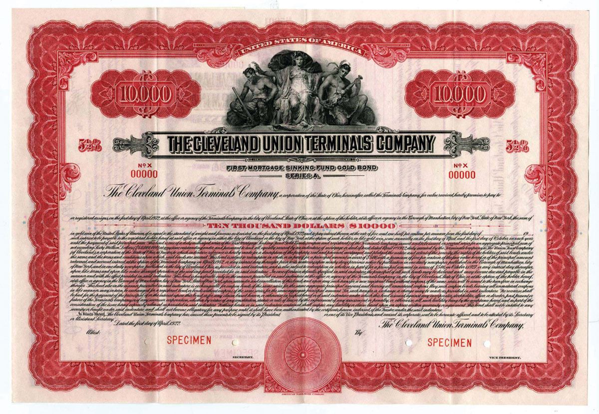 Cleveland, Ohio. Cleveland Union Terminals Co, 1922 $10,000 Specimen 5.5% Reg. Bond, Bond, VF. The former Cleveland Union Terminals Co. building is on the National Register of Historic Places under the name Union Terminal Group.