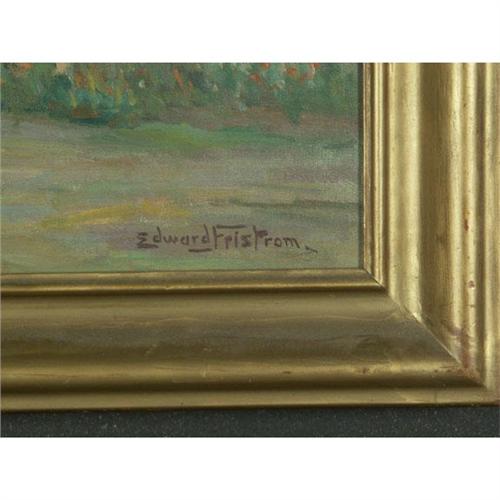 OIL ON CANVAS 25'' x 20'', Claes Edward Fristrom (1864-1950), CA. ''Carmel Mission, Calif.''. Signed lower right. Titled on the stretcher on the verso. Placed in a period goldtone frame. Born in Sweden, Fristrom traveled the world before settling in Central California where he focused on plein air landscapes of the Bay area. More info. in the white binder.