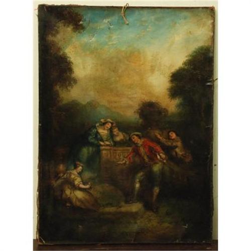 DESCRIPTION: GAMES IN THE COURT. Exceptional oil on canvas that reproduces a outside scene of French XIX century: some noble boys and girls are together chatting and playing in an elegant garden. The artist was exceptional in the painting the details of clothes made by cold and bright colours. The background is an elegant garden. The artist has used subtle and detailed brushstrokes to play the characters of the scene and other large for the background.