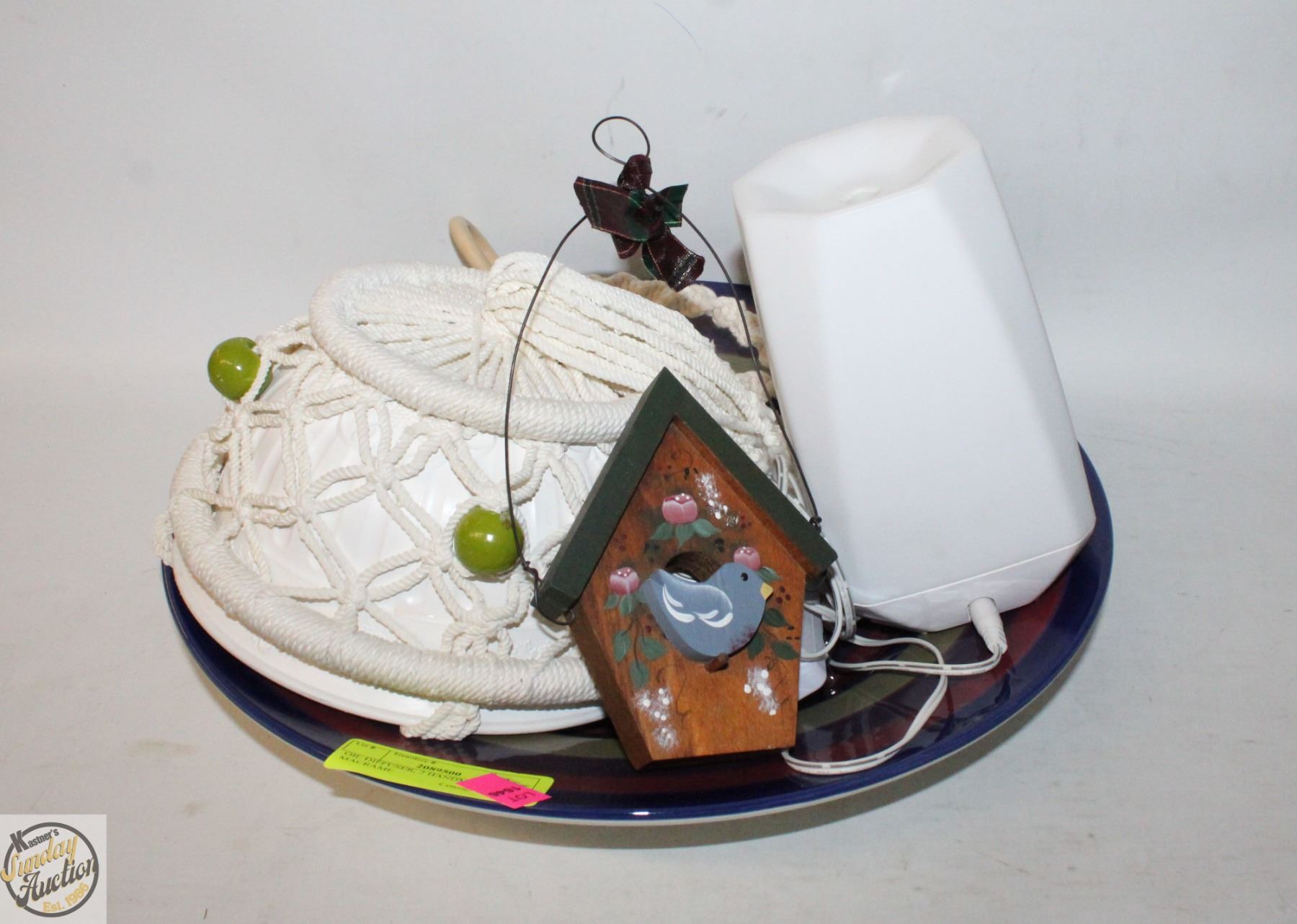PLANTER CEILING MOUNTABLE HANGERS + HANDPAINTED BIRDHOUSE WALL HANGING + DECOR PLATTER/LARGE BOWL **ALL ITEMS MUST BE REMOVED BY 5PM SATURDAY, AUGUST 9 2025. ALL REMAINING ITEMS WILL BE SUBJECT TO A $6.00 PER DAY STORAGE CHARGE. ANY ITEMS REMAINING AFTER MONDAY, AUGUST 25TH 2025 WILL BE CONSIDERED FORFEITED. NO REFUNDS WILL BE ISSUED FOR FORFEITED ITEMS. TO SCHEDULE A PICK UP APPOINTMENT CLICK HERE