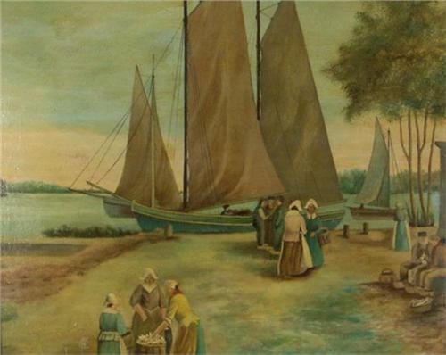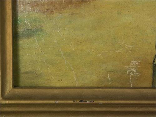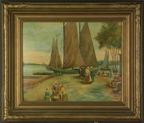 OIL ON PANEL 15 1/2'' x 19 1/2'', Unsigned. Primitive style Dutch harbor scene. Early 20th century. Some cracking and rubbing commensurate with its age. Placed in a gilt gesso frame stamped ''Seattle Art Co.'' on the verso, note condition.