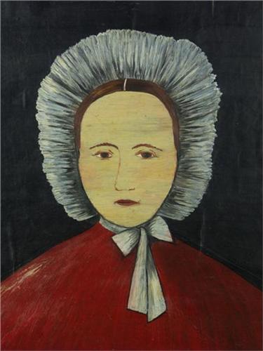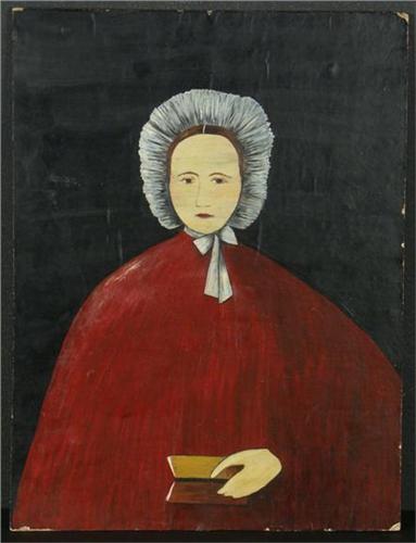 OIL ON PANEL 19 3/4'' X 14 7/8'', Unsigned. Portrait of an Early American woman in a primitive style. Circa 20th century. Note paint chipping on edges and some scratching to the interior. Unframed.