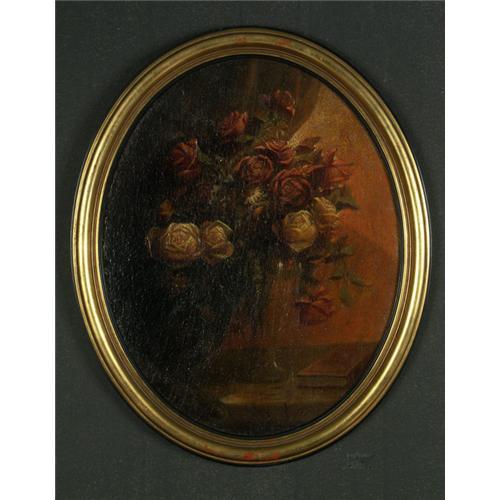OIL ON CANVAS 19 1/2'' x 15 1/4'' (Circular), Indistinctly signed lower right. An Elegant Flower Arrangement. Placed in a circular gilt frame with black trim, as seen.