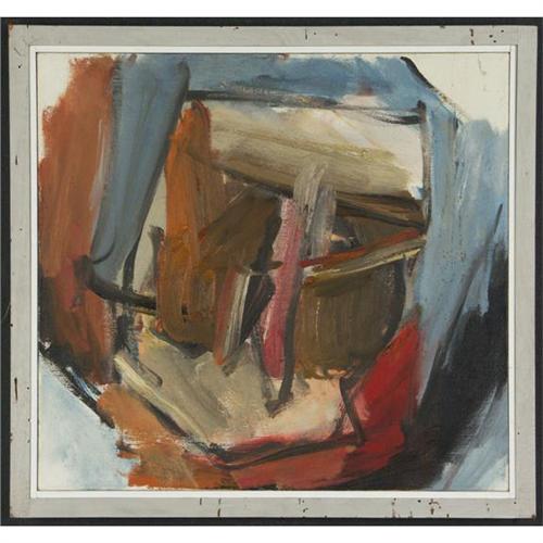 OIL ON CANVAS 11'' x 10'', Eugene Pizzuto (1925-2004), WA. An Abstract Composition in Blue, Orange, Red and Black. Unsigned. Placed in a fitted wormhole wood frame. A longtime UofW painting professor, Pizzuto was well known for his abstract landscape paintings. More info in the white binder.
