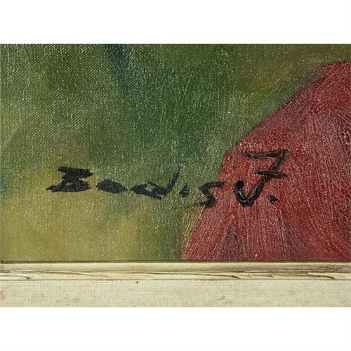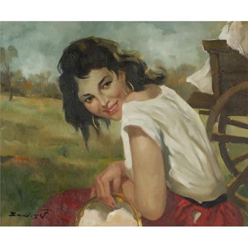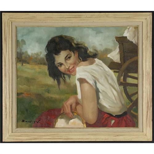 OIL ON CANVAS 20'' x 24'', F. Bodis (20th century), European. A Smiling Mediterranean Girl. Signed lower left. Placed in a blond wood frame with fabric matting. More info. in the white binder.