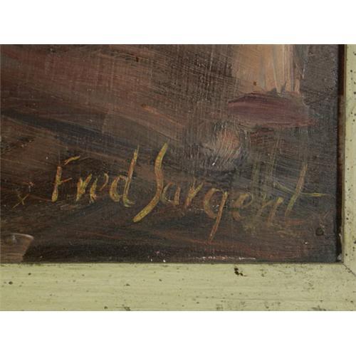 OIL ON PANEL 24'' x 30'', Fred Sargent (20th Century), American. Ship 'Mary' on the Dry Dock. Signed lower right. Placed in a cream-washed wood frame, surface darkening as seen. More info. in the white binder.