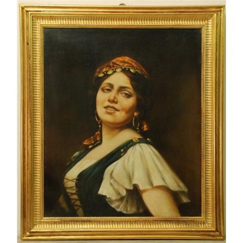 DESCRIPTION: INVOLVING PORTRAIT OF YOUNG GIPSY. A young and smiling gypsy, oval and fleshy face, hair collected in a red handkerchief from which metal coins hang, gold circle earrings, is portrayed frontally in the foreground. Her close bodice highlights the generous chest and this helps to make the women even more sweet and engaging; an expressiveness emphasized by her eyes and dimples, hardly mentioned on her face. The gaze is directed towards the observer, red and fleshy lips opened up in a smile. The woman shows herself to the user without reservations, offering a cheeky expression. In the dark background the vibrant and lively colours stand out. The feeling that the picture lavishes is of extraordinary strength and sensuality. The brushstrokes are vigorous and decisive.