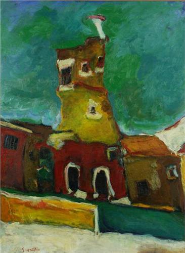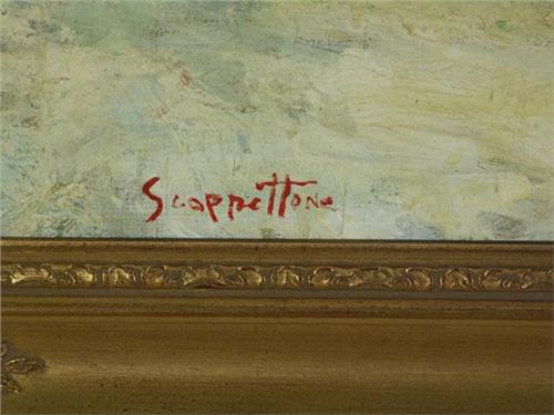 OIL ON CANVAS 48'' x 36'', James Scoppettone (1937-), CA. An Impressionistic image of a building. Signed lower left. Placed in an ornate gilt frame. Like the Impressionistic masters before him, Scoppettone's interest lies in studing the nuances of light. More info. in the white binder.